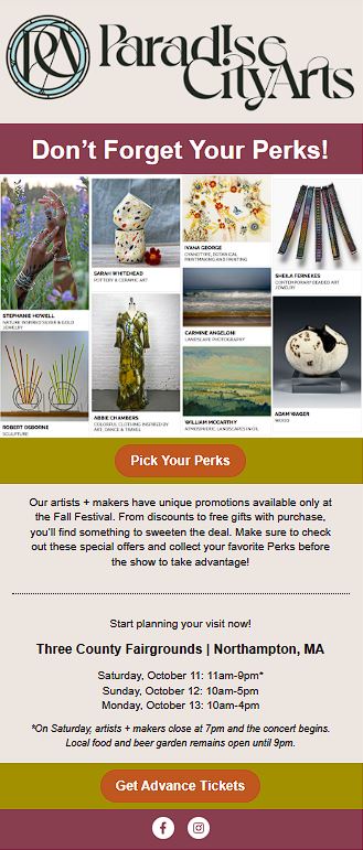 Our 50,000 recipients of the Guide will see your work up close– directing them to your name, contact information, and booth number at the show. The photoshoot will also live on the Paradise City Arts website & social media.